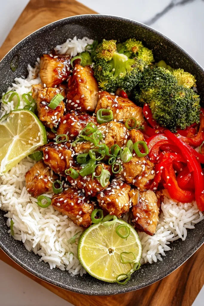 - Create an Asian-inspired rice bowl by spooning warm jasmine or brown rice into bowls, topping with your saucy chicken, and garnishing with sliced scallions, sesame seeds, and a wedge of lime.