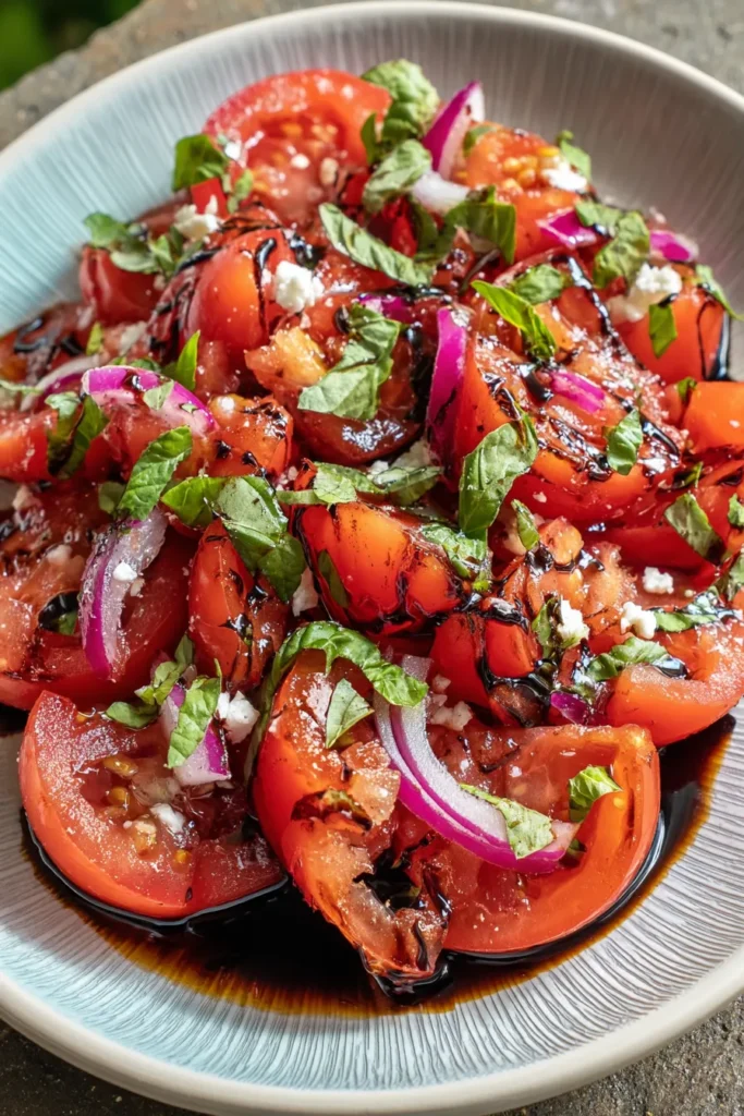 This easy salad showcases juicy tomatoes, zesty red onion, and fragrant basil, all tossed in a rich balsamic dressing for a burst of flavor that'll brighten any meal.