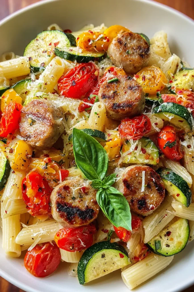 This delightful dish combines juicy chicken sausages, vibrant zucchini, and plump tomatoes, all nestled with pasta and topped with rich Parmesan cheese for a satisfying meal.