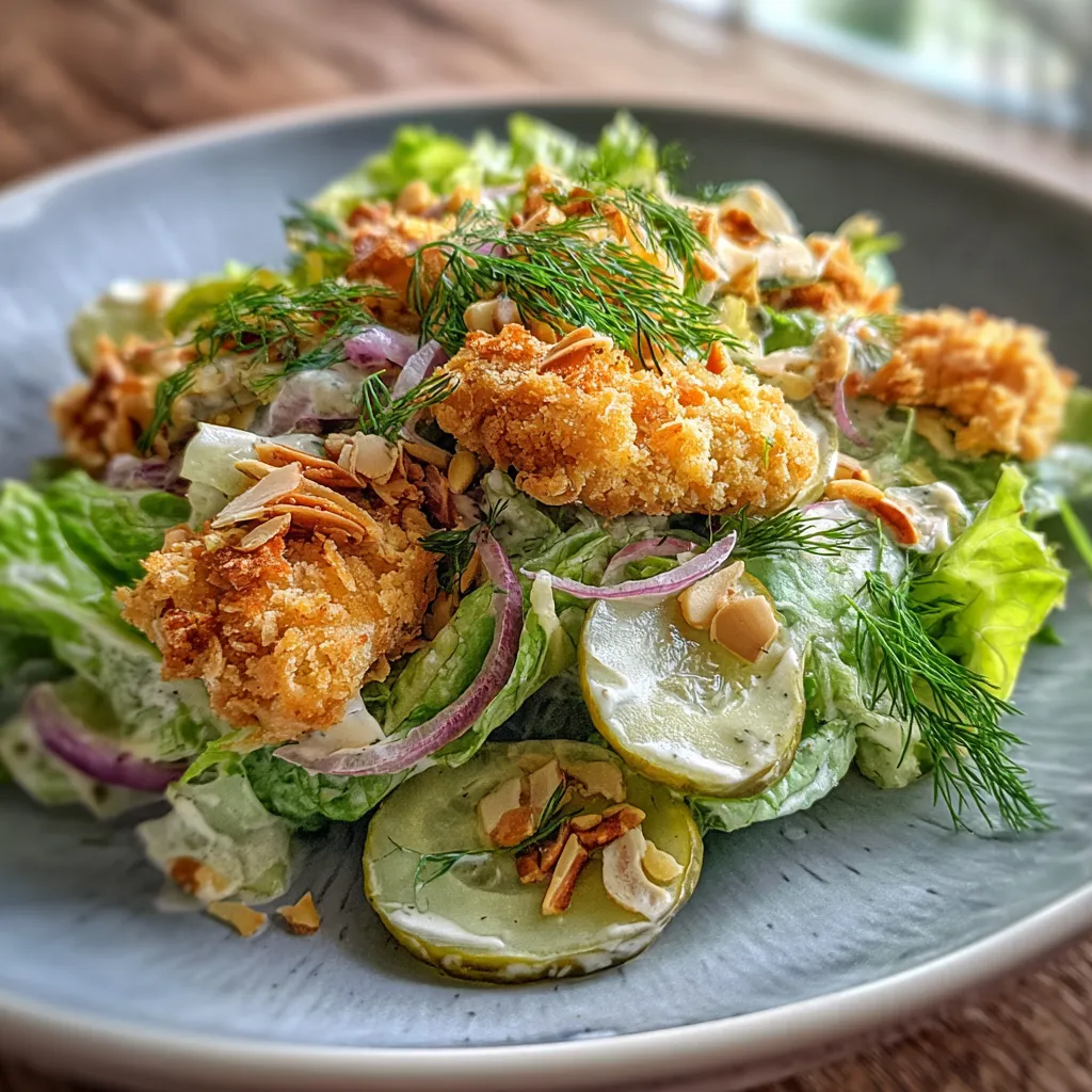 This Crunchy Chicken Salad with Tangy Dill Pickle Flavor hits all the right notes: it’s a crunch fest of golden panko-crusted chicken atop a crisp romaine and celery bed, all brought together by a creamy-yet-zesty pickle dressing. Why does it work? The balance of textures (crisp, creamy, crunchy) and flavors (savory, tangy, nutty) makes every bite unforgettable. Print and save this recipe—you’ll want to whip it up again and again. Got thoughts or questions? Drop a comment below, and let’s chat about your crunchiest creation!