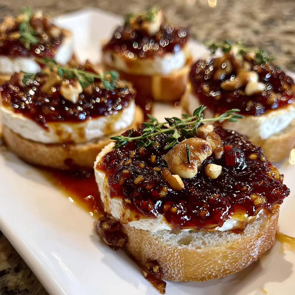 - Elegant Platter Display: Arrange the crostini on a long wooden board, alternating jam and nut toppings for visual interest, and tuck sprigs of thyme between bites.
