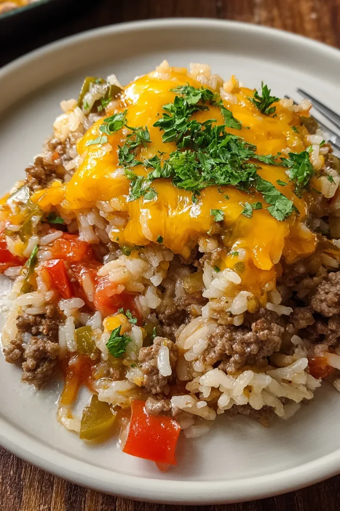 Beyond its deliciousness, this casserole is a testament to the beauty of simple, unfussy cooking. You don’t need a long list of fancy ingredients or complicated techniques—just fresh produce, pantry staples, and a dash of enthusiasm. As you stir those spices—garlic powder, paprika, a hint of Worcestershire—you’ll find yourself swept into a rhythm that makes the process as enjoyable as the payoff. And speaking of payoffs, when you lift the foil at the tail end of baking, the sight of melted golden cheese glistening on top is pure magic. It’s a dish that invites conversation, shared laughter, and maybe even that extra scoop for those who simply can’t resist its comfort. So pull up a chair, grab your favorite spoon, and let’s dive into the delicious details of this mighty Hamburger Rice Casserole!