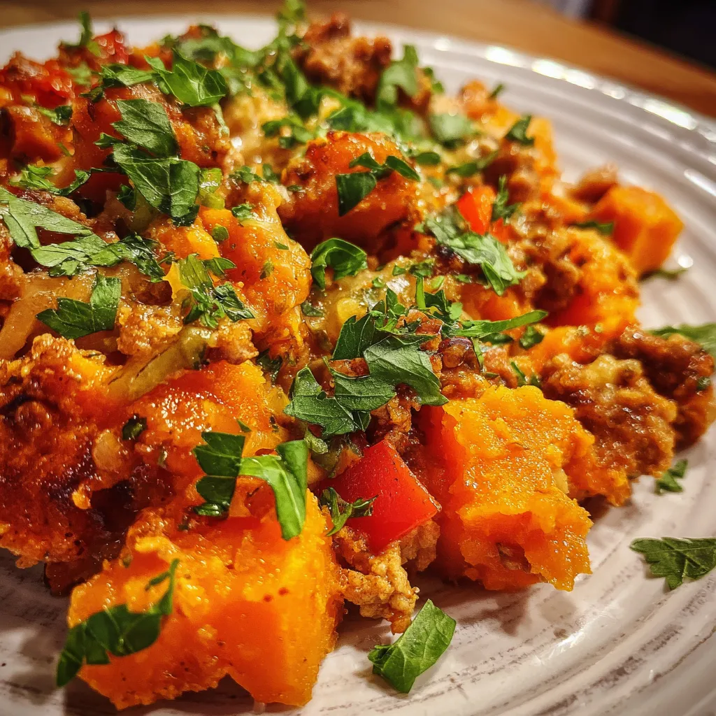 Golden sweet potato cubes soften beneath melted cheddar as smoky-spiced turkey and wilted spinach come together in a colorful, hearty bake that's warm, comforting, and packed with protein.