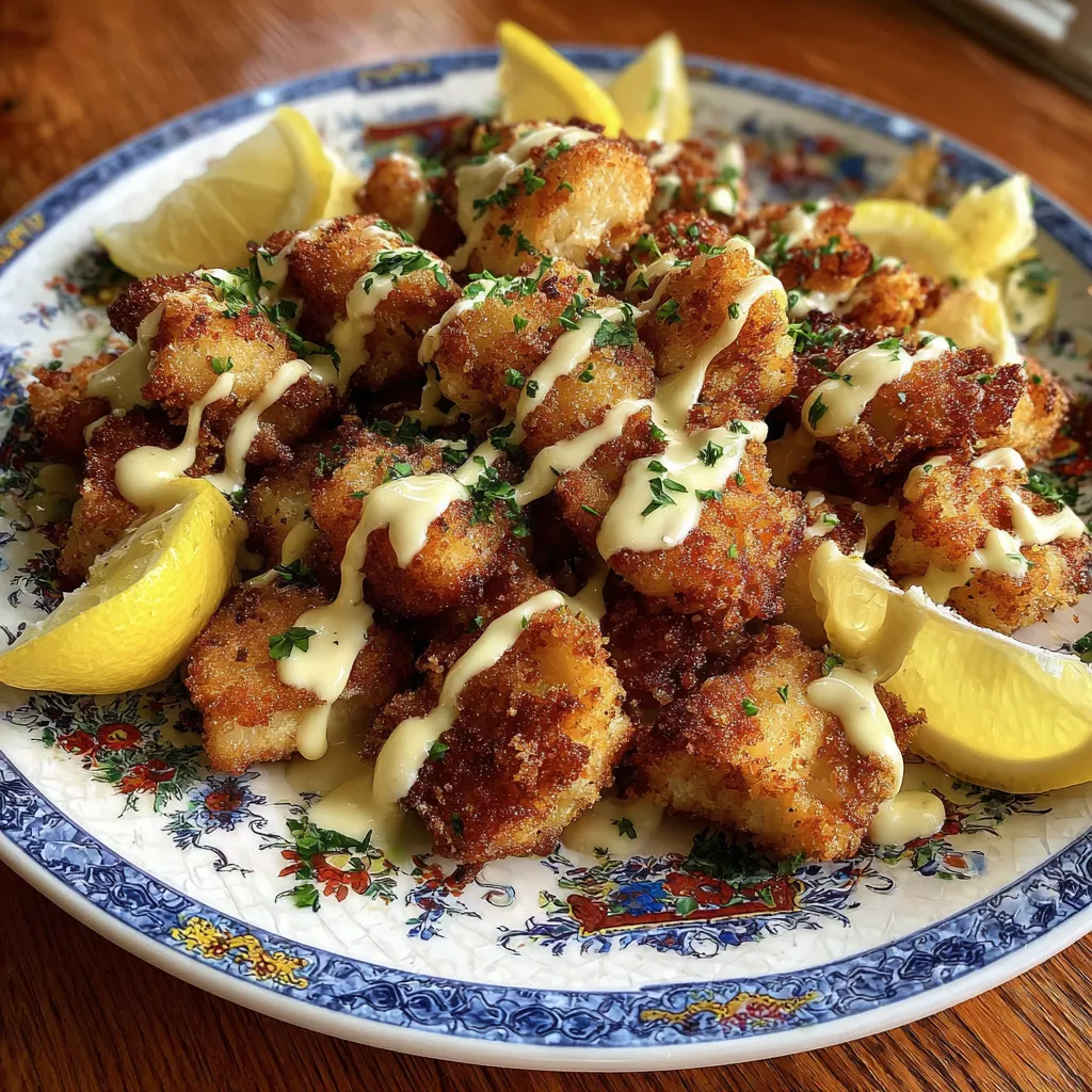 These golden fish bites crackle under each bite, their buttery lemon glaze tangling with fresh parsley, while the garlicky aioli offers a cool, rich contrast you’ll crave on repeat.