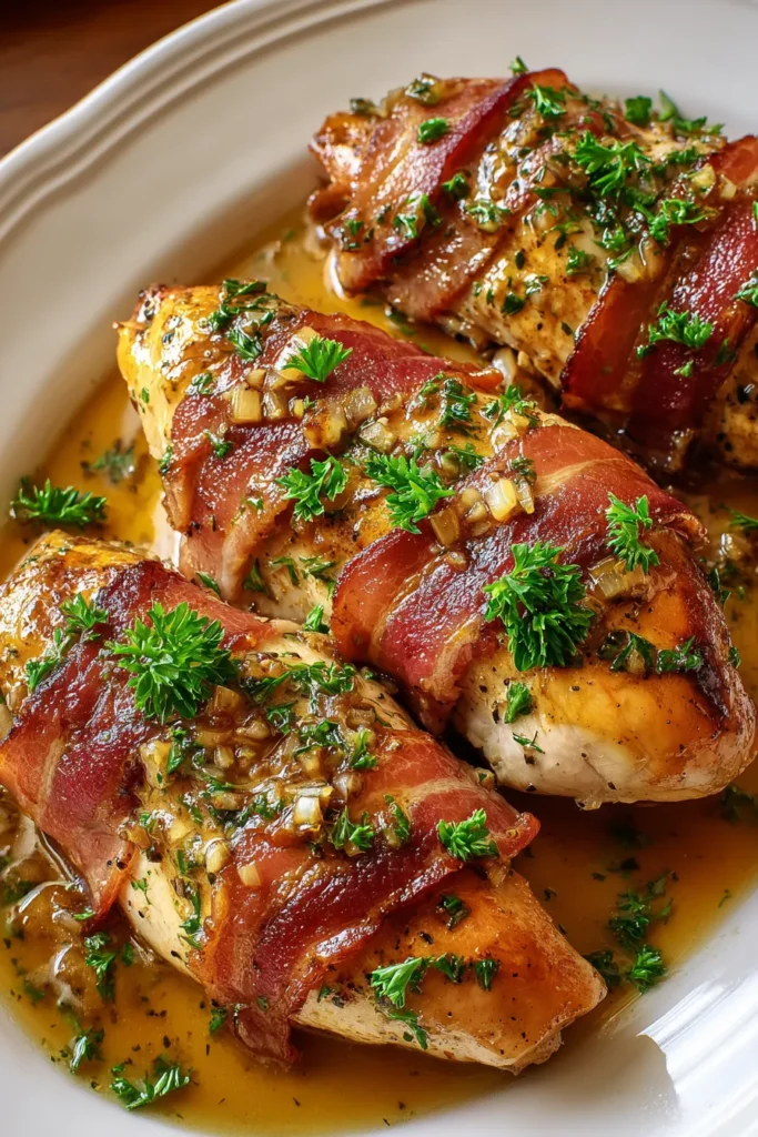 Rich, smoky bacon wraps around the chicken, sealing in moisture and adding a crunchy texture. Using thick-cut bacon helps it stay crisp through searing and baking.