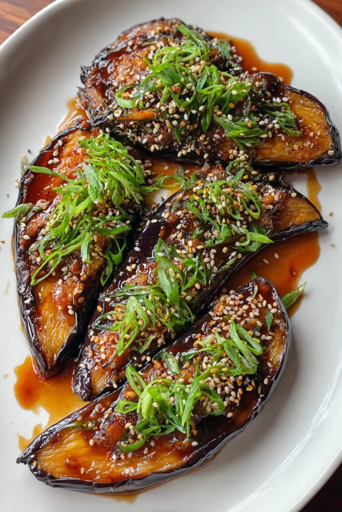 Serve the eggplant as an elegant side dish next to grilled chicken, salmon, or tofu skewers. The sweet-salty umami contrast pairs beautifully with charred meats or plant-based proteins.