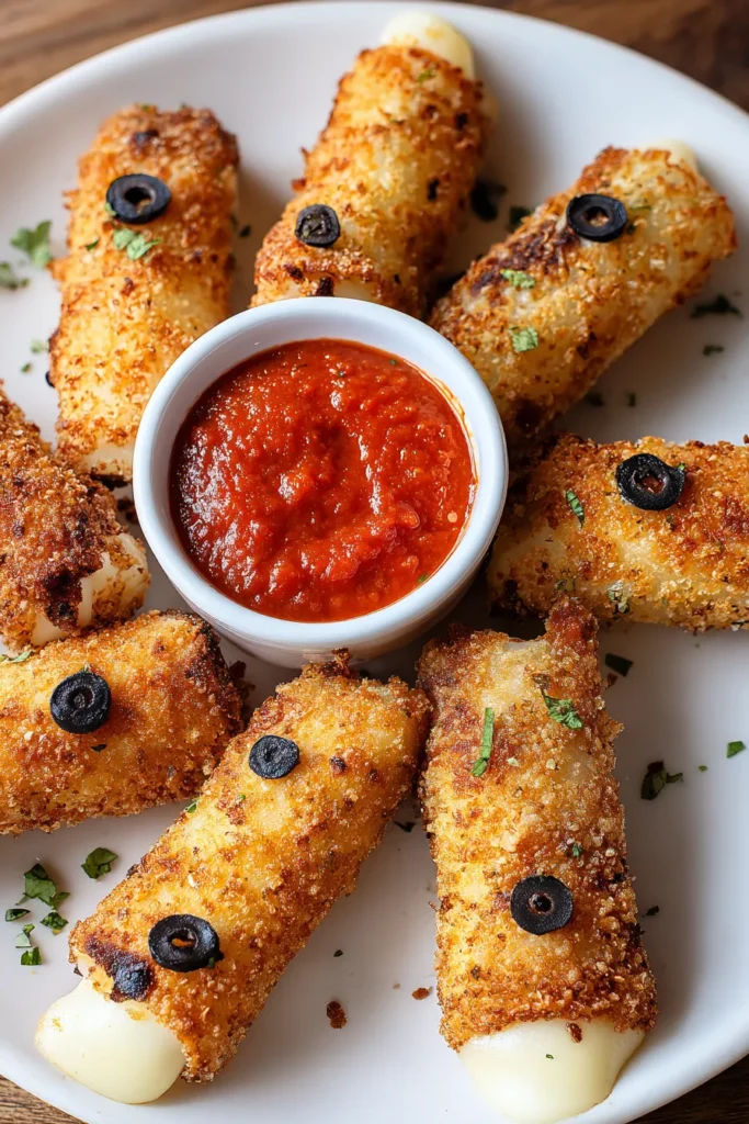 Crispy, cheesy, and oh-so-fun, these Mummy Mozzarella Sticks are wrapped like little mummies and served with marinara for a hauntingly delicious treat.