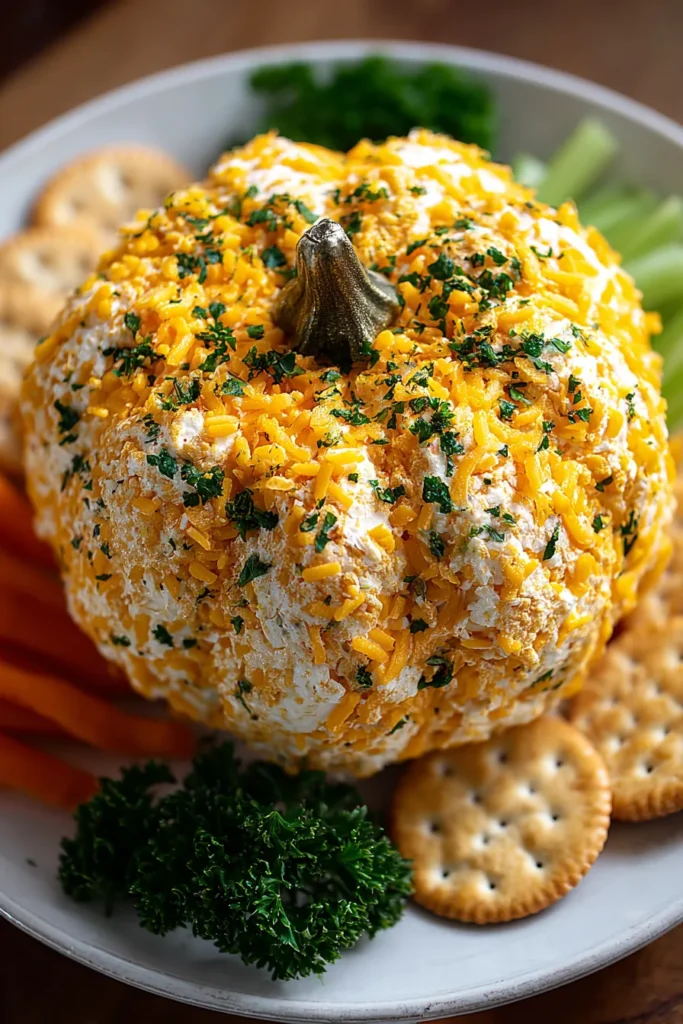 10. Serve your pumpkin-shaped cheese ball with crackers and freshly cut vegetables, arranging them around your centerpiece for a picture-perfect presentation.