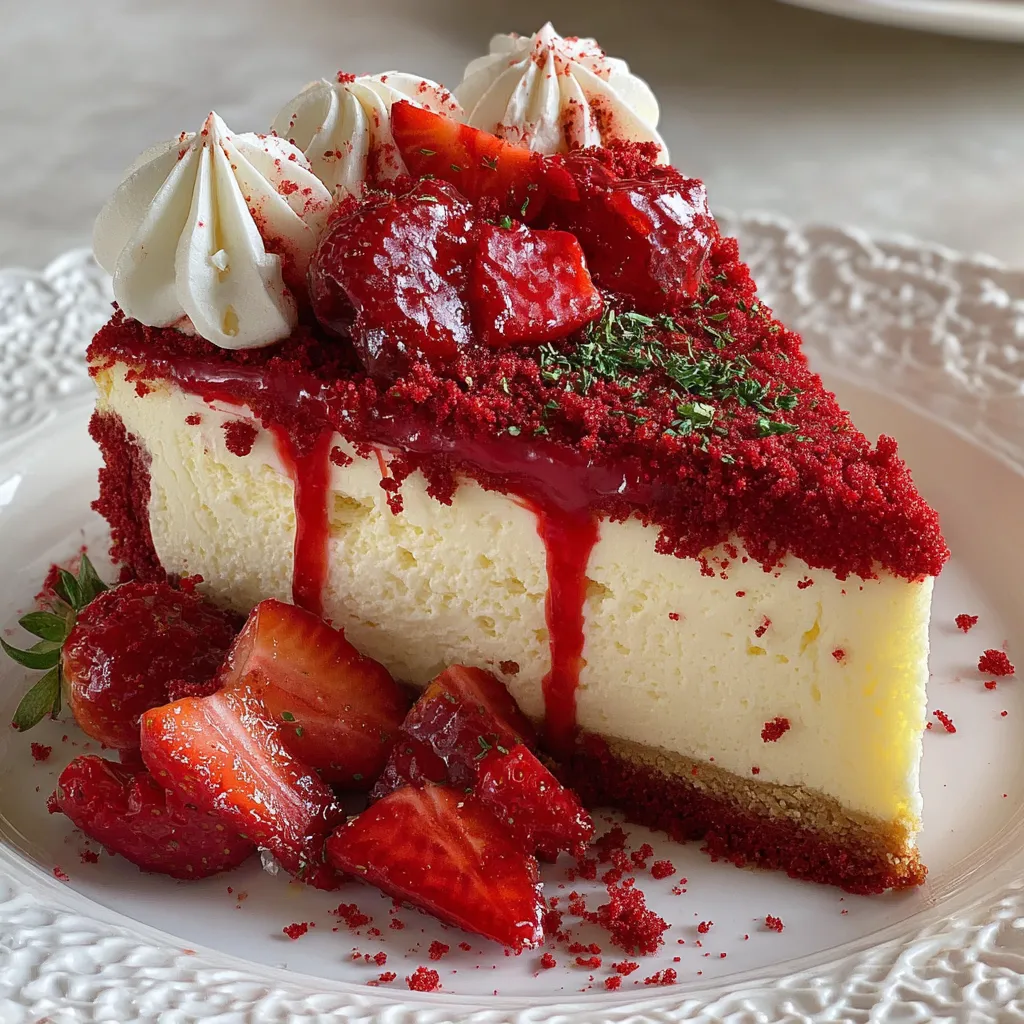 Red Velvet Strawberry Cheesecake is the ultimate indulgence for anyone craving something both elegant and playful. With velvety red batter swirls dancing through a tangy cream cheese filling, a buttery graham crust beneath, and a cloud of whipped cream on top, every bite is a rollercoaster of flavor. The fresh strawberry compote adds bright pops of sweetness, while that iconic red hue makes it a showstopper at any gathering. If you love homemade cheesecake adventures or simply want to impress dessert lovers, this recipe is your next kitchen triumph.