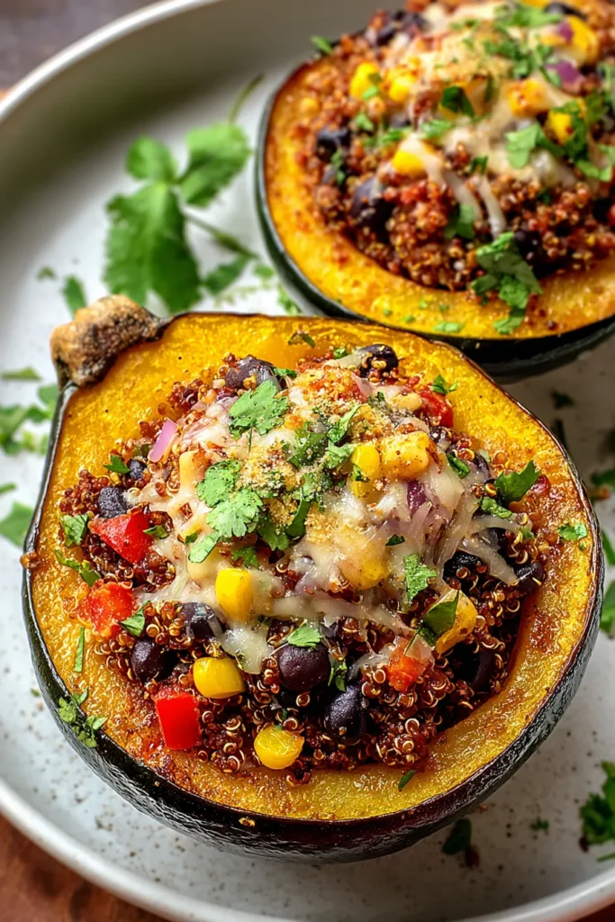 These savory stuffed acorn squashes combine creamy quinoa, black beans, and vibrant veggies, all topped with melted cheese for a cozy, satisfying meal.