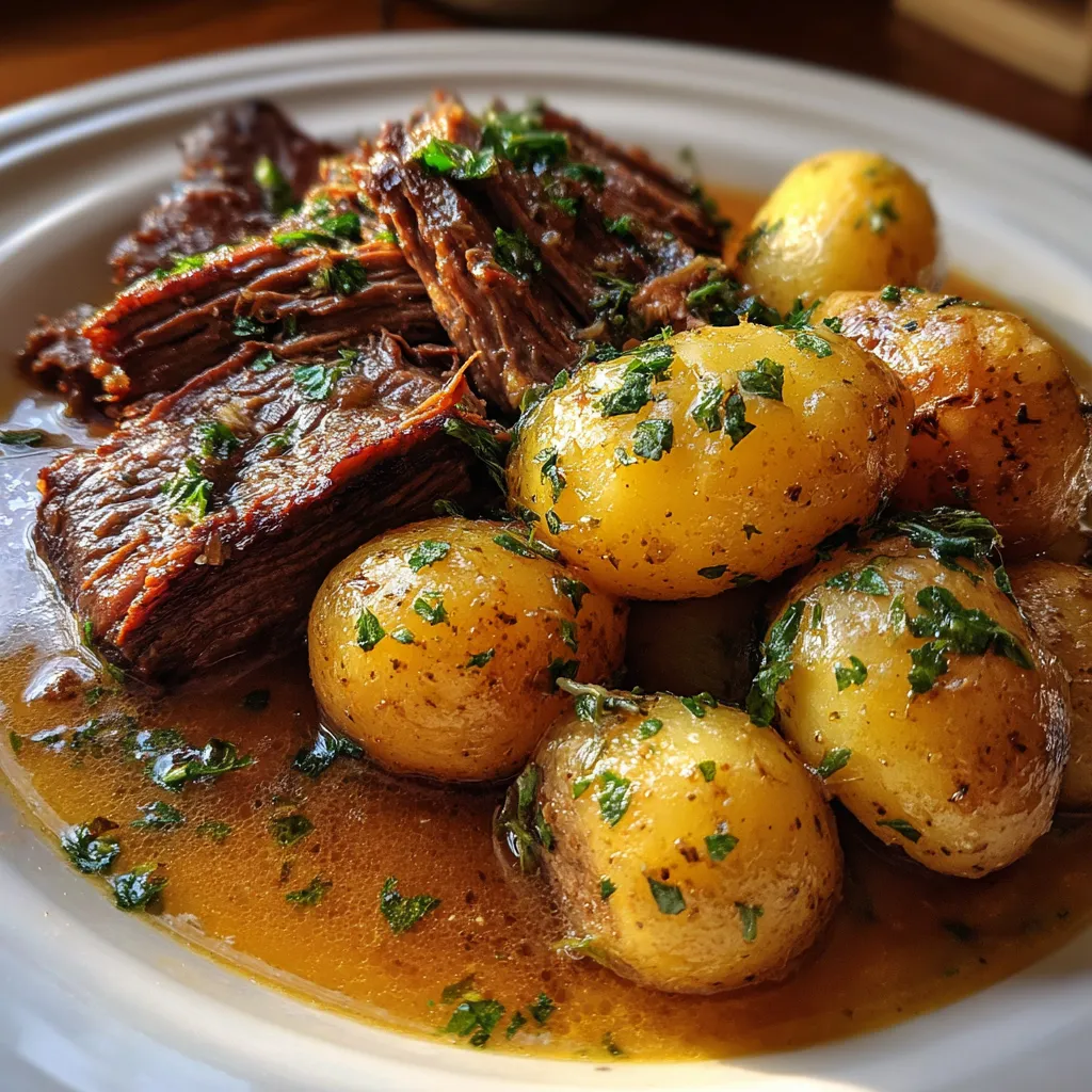 Beef chuck roast simmers for hours in garlic-kissed butter, infusing the baby potatoes with rich, savory juices. Aromatic thyme and rosemary deepen the flavor for a cozy, fuss-free meal that melts in your mouth.