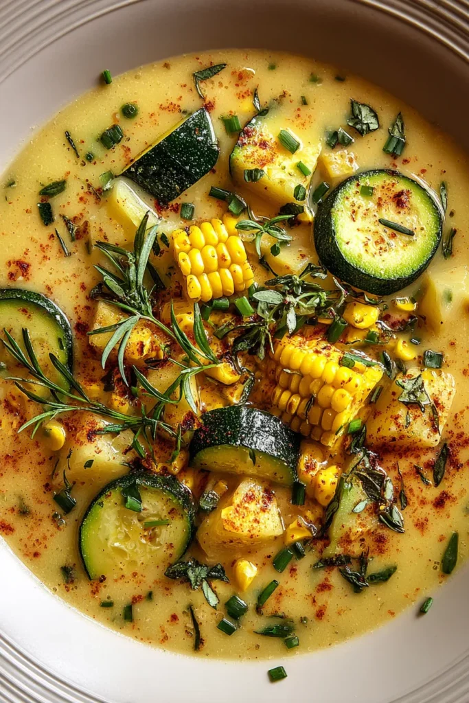 This Summer Corn Zucchini Chowder has all the charm of a cozy comfort soup fused with the bright, fresh flavors of peak summer produce. From the first aromatic sauté of onion and garlic to the final swirl of chives, you’ve walked through every step to create a dish that’s both simple enough for a busy weeknight and special enough for weekend gatherings. With its beginner-friendly technique, healthy ingredients, and make-ahead flexibility, it’s destined to become a staple in your recipe collection. Don’t forget: you can print this article and save it for later, ensuring you’ll have these instructions at your fingertips whenever the corn is at its sweetest or the zucchini is begging to be used up. You’ll also find a FAQ below to answer any lingering questions about substitutions, vegan variations, or reheating tips.